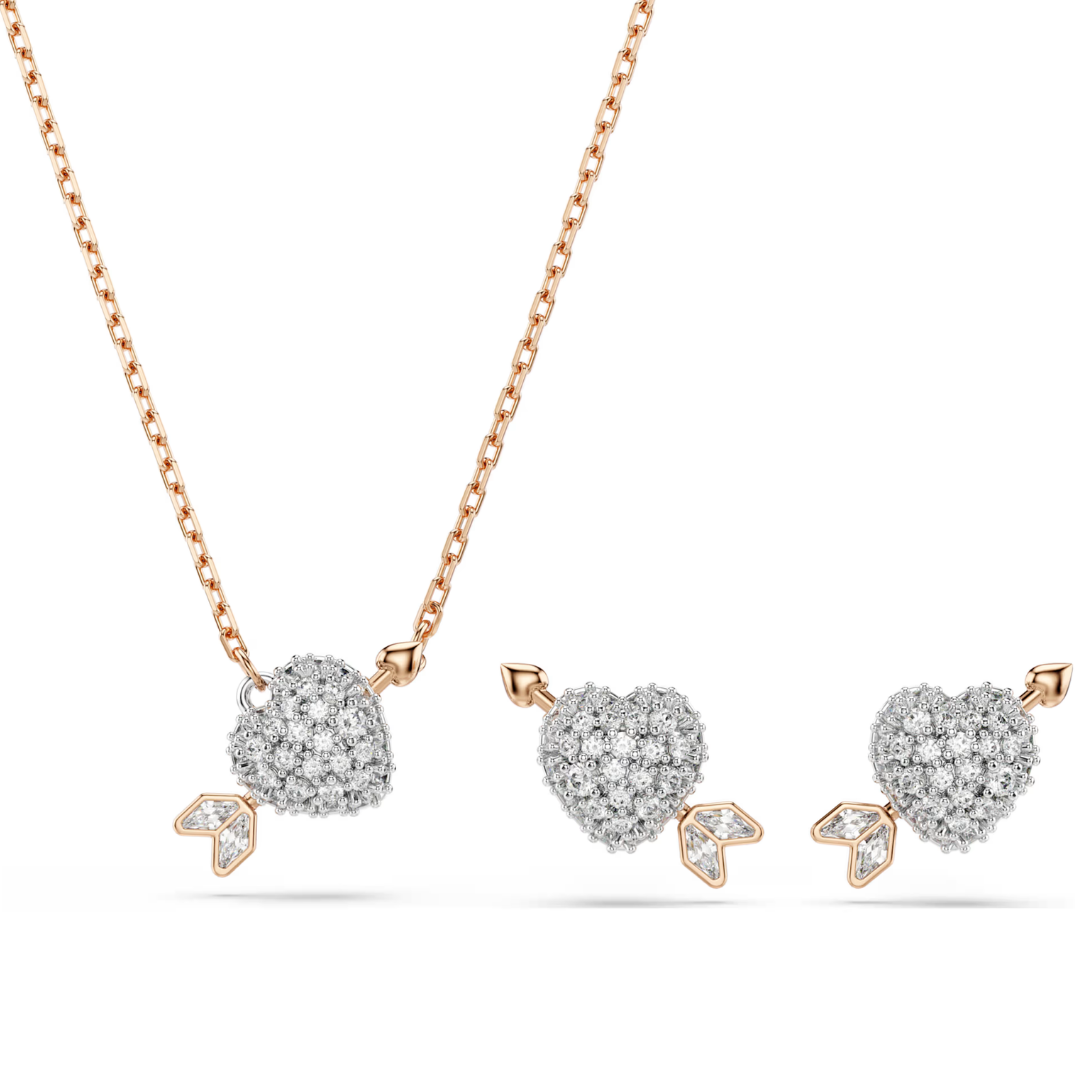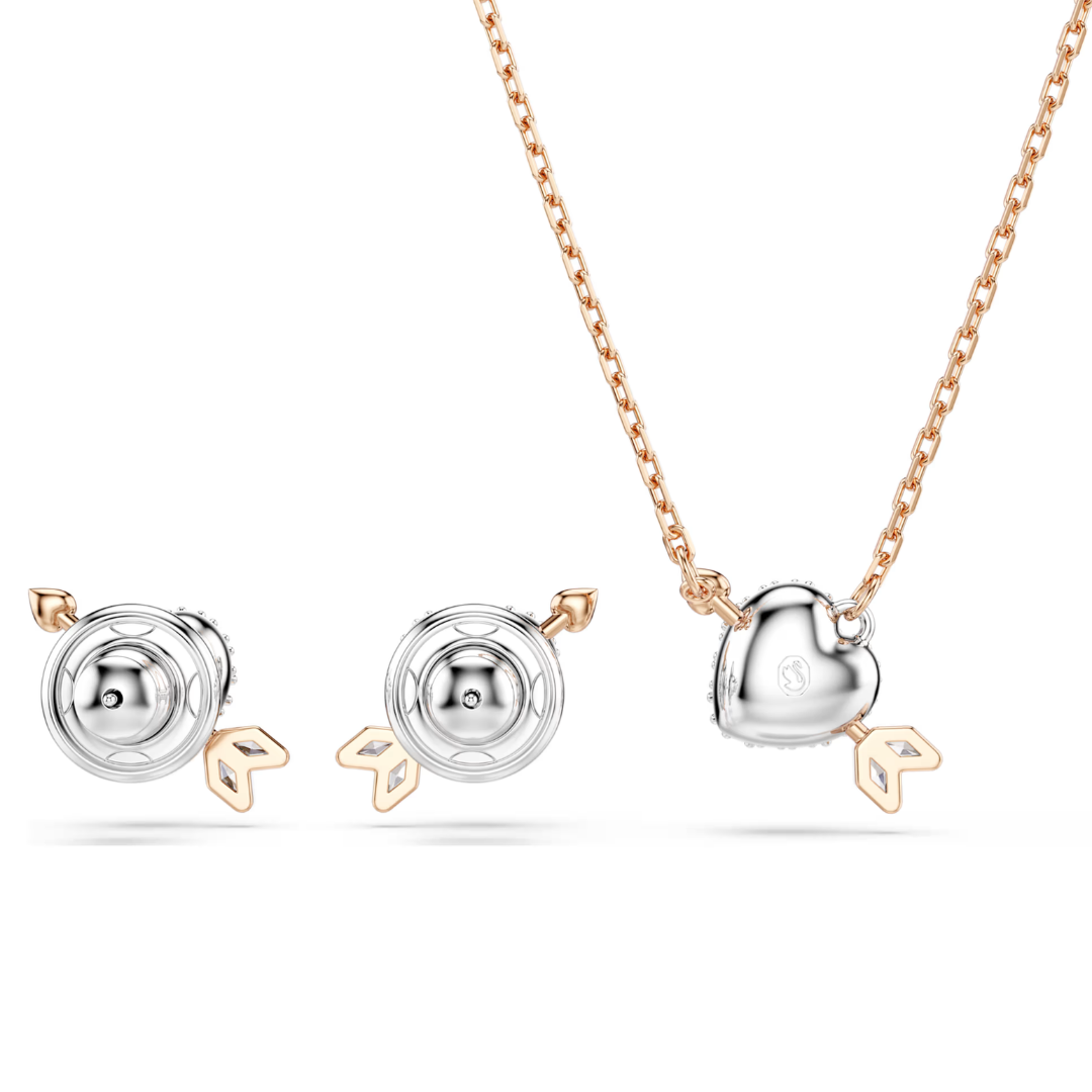 הכניסו תשוקה לסטייל שלכם עם סט תליון ועגילים נוצצים זה. כל לב מצופה רודיום מעוטר בגבישים שקופים ומנוקב בחץ בגוון זהב ורוד של קופידון. שילוב ייחודי לימים בהם האהבה ראויה לזרוח.