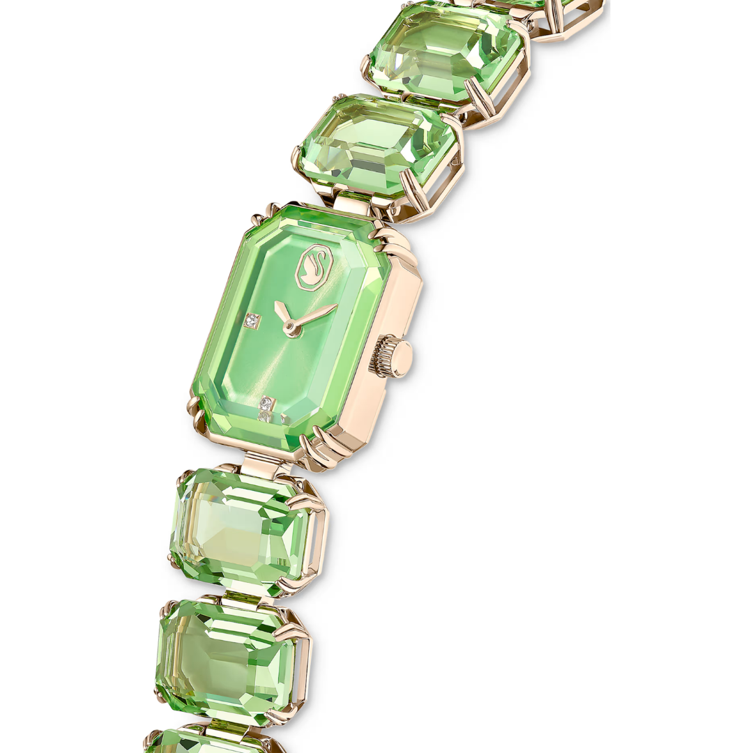 שעון צמיד מושך עין זה, בהשראת משפחת מילניה, מעניק מראה צבעוני ופופולרי. הוא מעוצב בצורה מקצועית משורה של גבישים חתוכים מתומנים בגוון ירוק עז, וכולל חוגה ירוקה, מסגרת גבישית וגימור בגוון זהב שמפניה. הוא עמיד במים עד 50 מטר ומהווה בחירה נועזת לעיצוב סולו או ללבישה בשכבות.