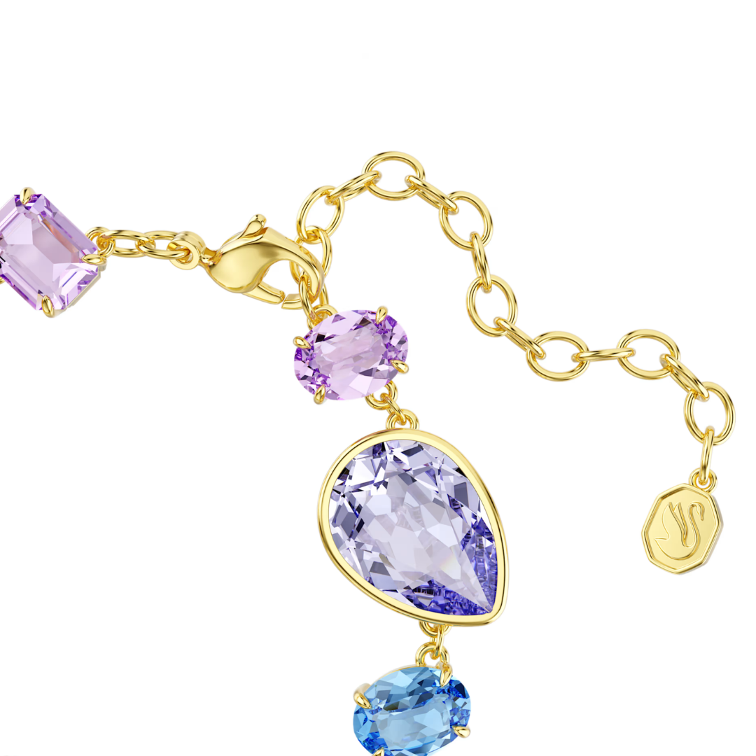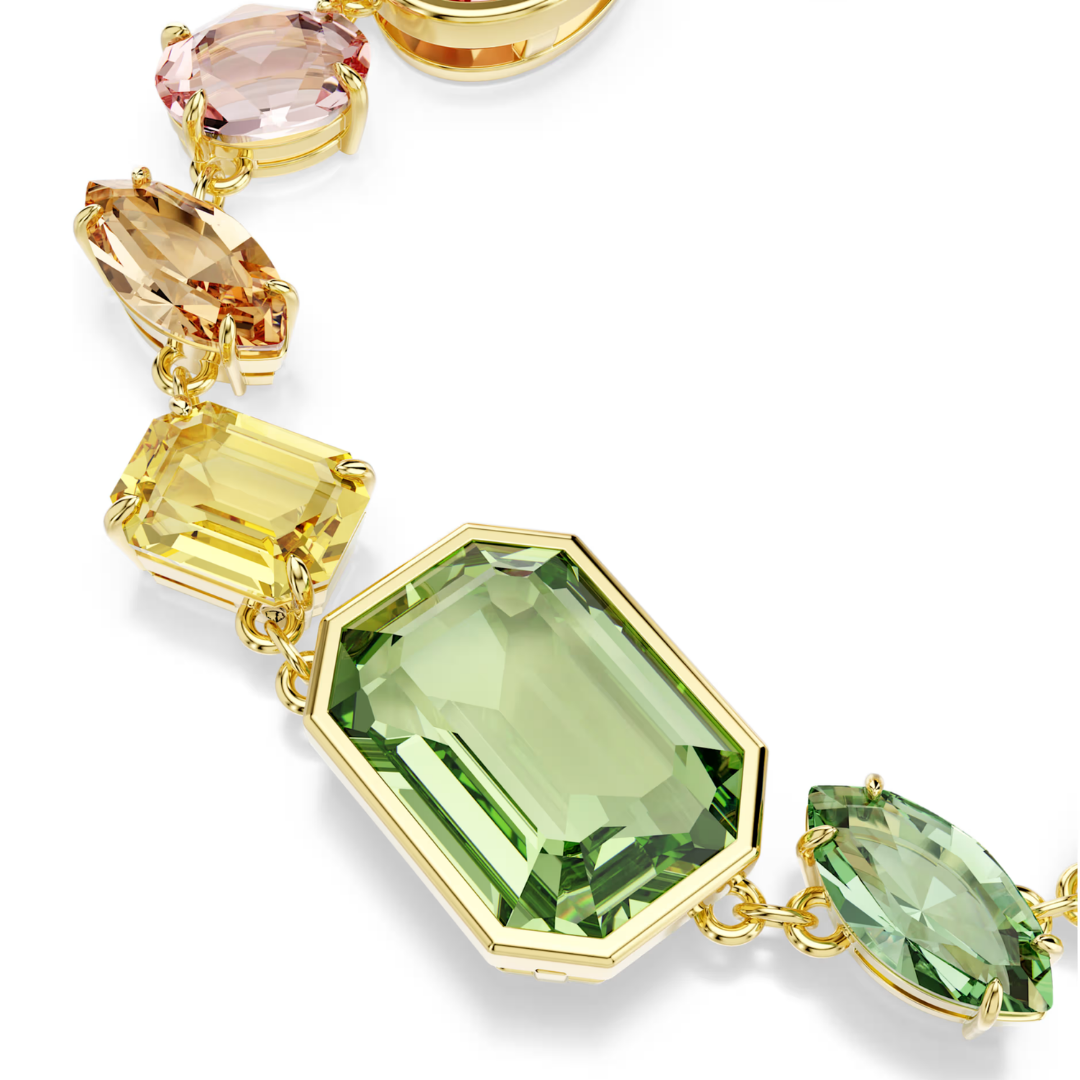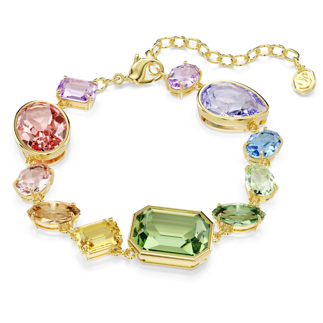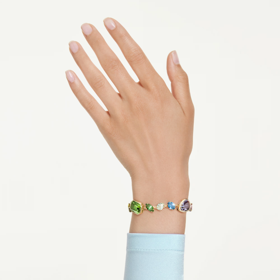 צמיד זה בגוון זהב, מעוטר בקריסטלים מכל צורה וצבע, מגלם את הסגנון השמח והבלתי צפוי של משפחת ג'מה של סברובסקי. העיצוב משיג תחושה של ריגול באמצעות הסידור הא-סימטרי שלו, בעוד שניתן להוסיף את המגע האישי שלך על ידי קישוט הצמיד בצ'ארמס ממשפחת אידיליה שלנו.