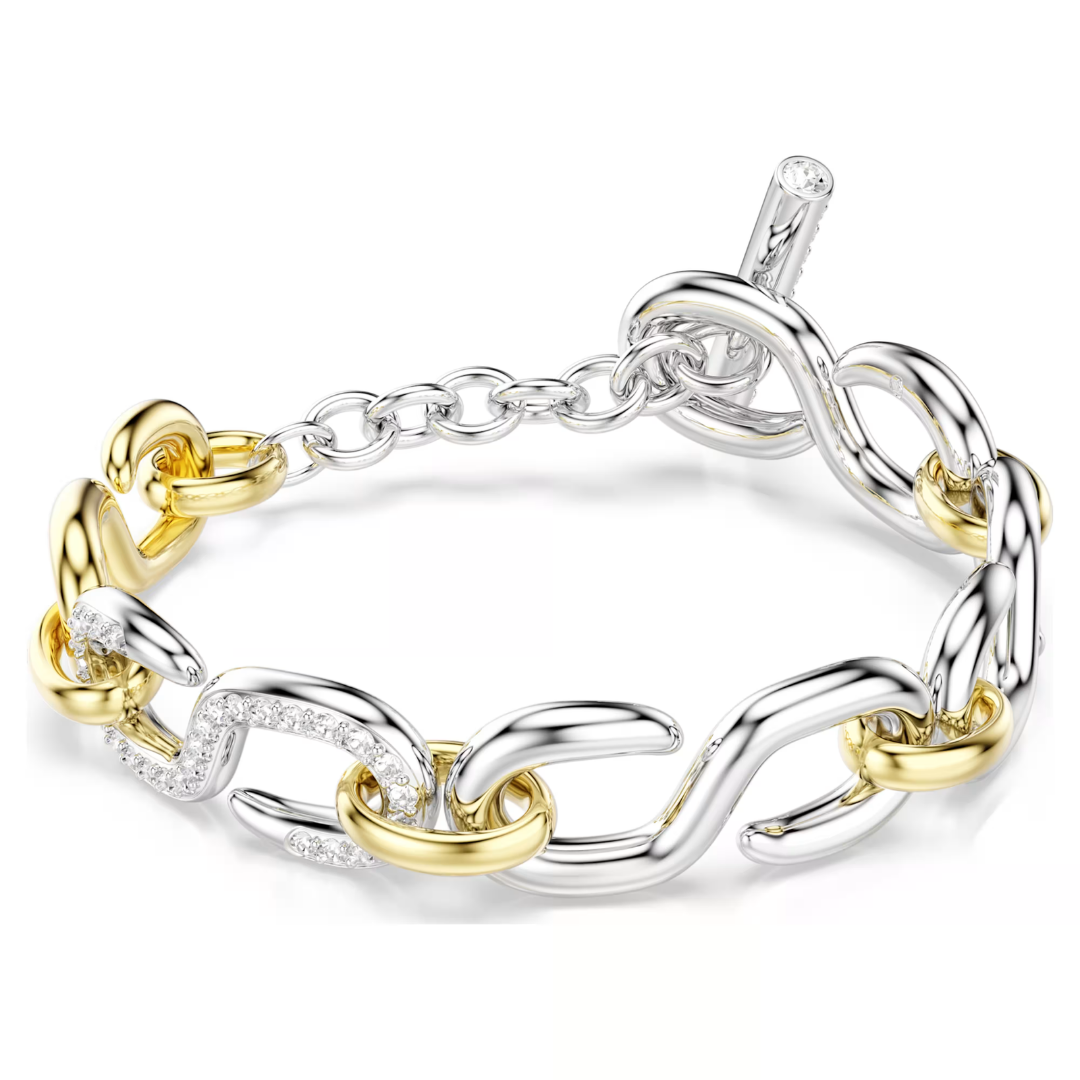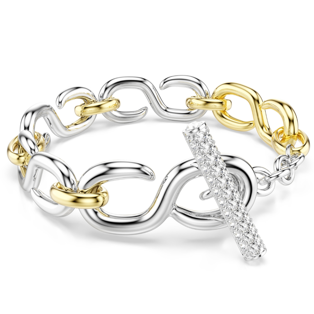 צמיד סברובסקי זה, המשחק עם ניגודי מתכת, מגלם את הסגנון התעשייתי של דקסטרה. העיצוב כולל חוליות מתחלפות בציפוי זהב ורודיום, בעוד שאלמנט המוט משובץ בגבישים שקופים לזוהר מקסימלי. שלבו אותו עם פריטי דקסטרה תואמים אחרים בעלי אותה צללית ייחודית.