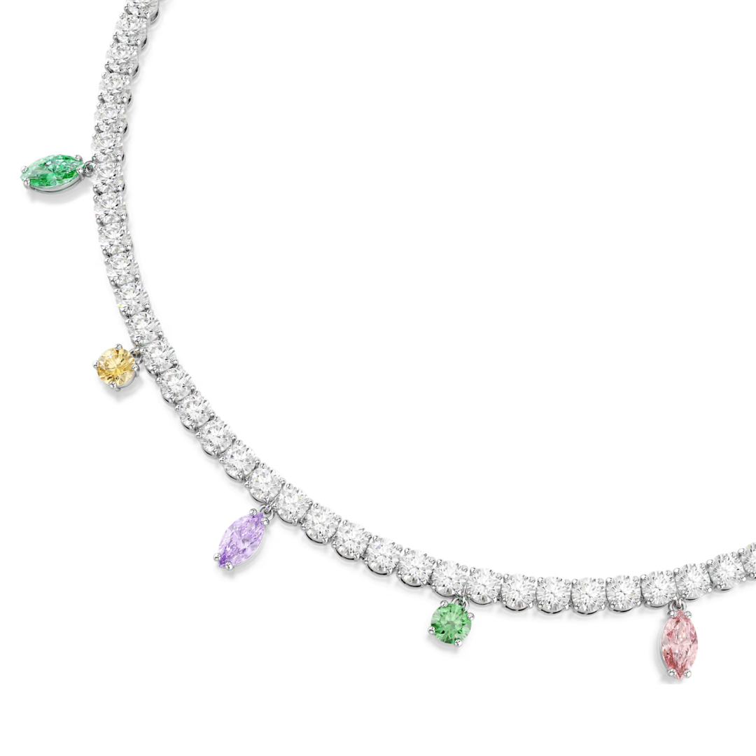 תכשיט מתכוונן זה, המציע הרמוניה מרהיבה של צבע ואור, ניתן לענוד כשרשרת או כצ'וקר. העיצוב המצופה רודיום כולל גדיל אחיד של זירקוניה סברובסקי שקופה ומגוון צבעי פסטל התלויים מתחת בחיתוכים מעורבים. הציתו את היצירתיות בסטייל שלכם עם תכשיט זה וענדו אותו עם הצמיד התואם מאותה משפחה.