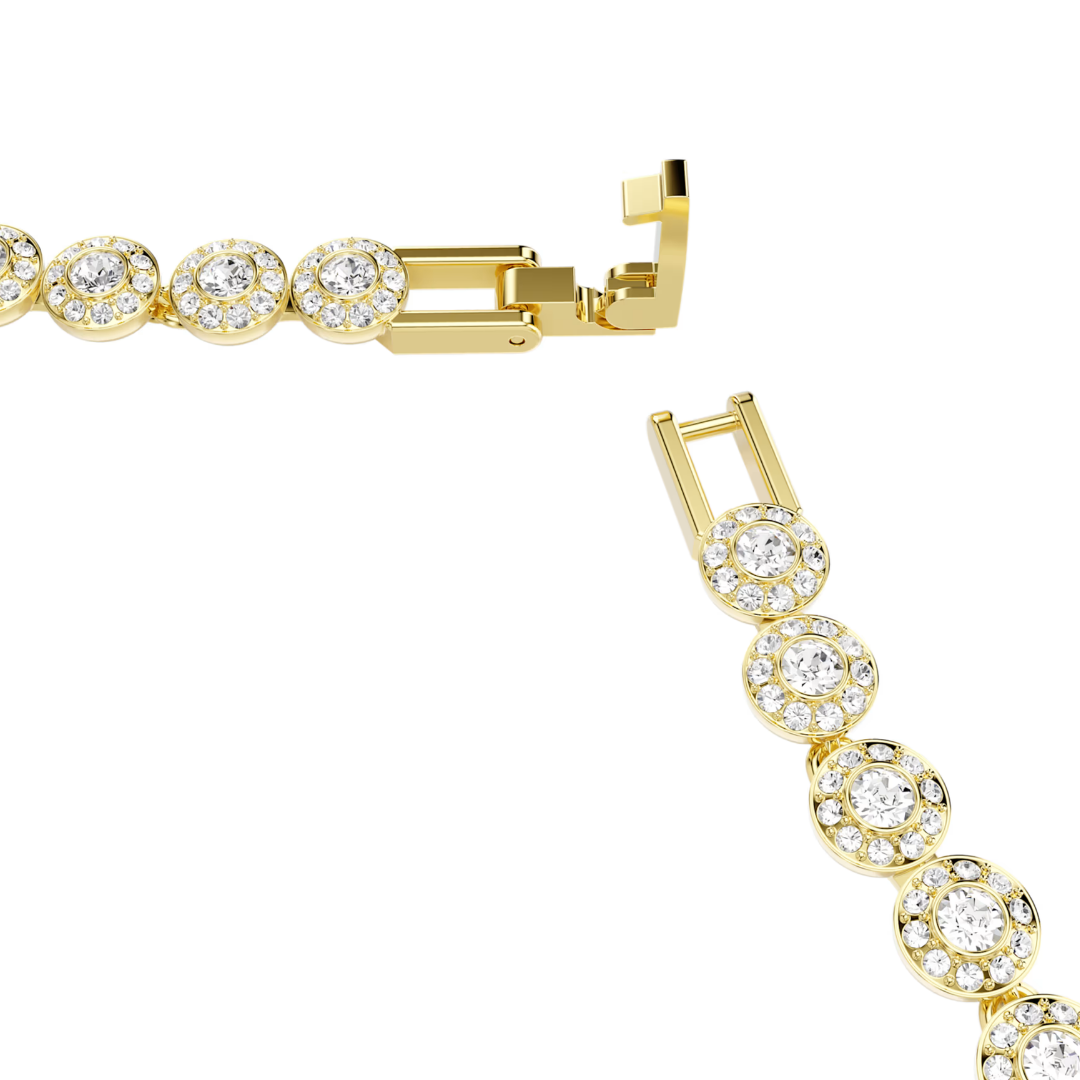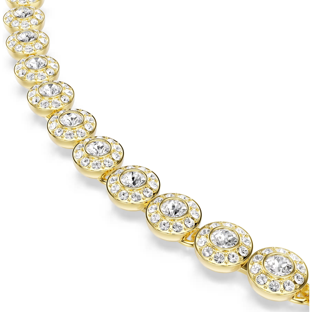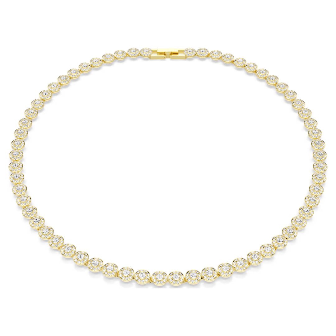 שרשרת אונה הזוהרת הזו, לוכדת מראה של תחכום נצחי, היא אחת הצלליות היקרות ביותר של סברובסקי. העיצוב המצופה בגוון זהב כולל סביבה מלאה של גבישים עגולים גדולים, כל אחד ממוסגר בהילה של פאבה שקופה. אבזם המתקפל מספק סגירה חלקה, בעוד שהמאריך הנוסף מאפשר לך להתאים את התכשיט לנוחות ולגודל. דרך מושלמת להדגיש את הזוהר בסגנון היומיומי שלך.