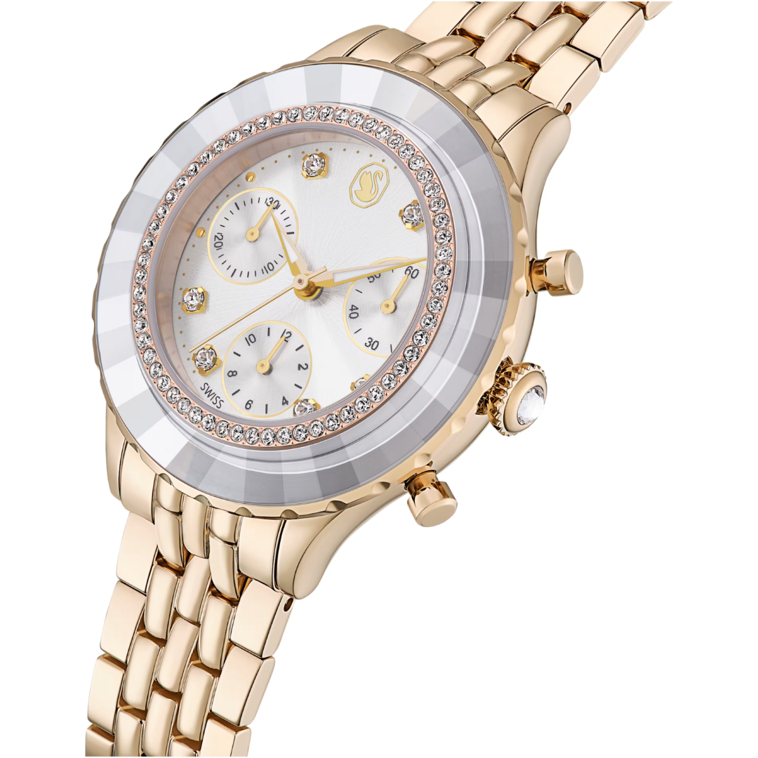 שעון כרונוגרף מסנוור זה משלב בצורה מושלמת מומחיות בייצור שעונים עם ניסיון של סברובסקי. גוף השעון בקוטר 37 מ"מ עשוי בגימור זהב שמפניה וכולל מסגרת גבישית, משובצת בקפידה ומלווה בעיגול פאבה שקוף. מתחת לזכוכית המינרלית, לוח השמש הלבן כולל לוגו ברבור בשעה 12, מחוגים זוהרים ושלושה מוני כרונוגרף למדידות נפרדות של שעות, דקות ושניות. ישנם גם שישה גבישים שקופים המשמשים לאינדקסים וגביש בודד הממוקם בכתר השעון. שעון זה, העומד על צמיד מתכת מתכוונן, עמיד במים עד 50 מטר.